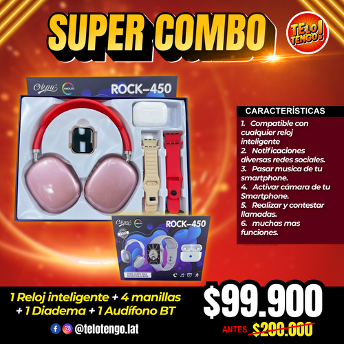 Mega Combo 4x1 Reloj Inteligente + 4 Manillas + Audifonos inalambricos + Diadema Inalambrica