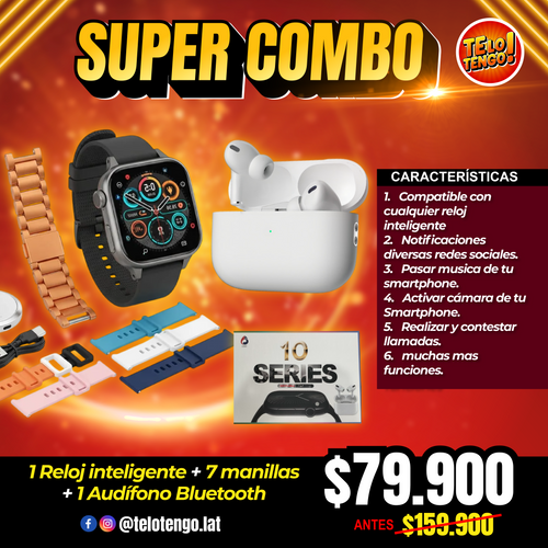 Mega Combo 3x1 (Reloj Inteligente + 7 Manillas para reloj + Audifonos Inalambricos)