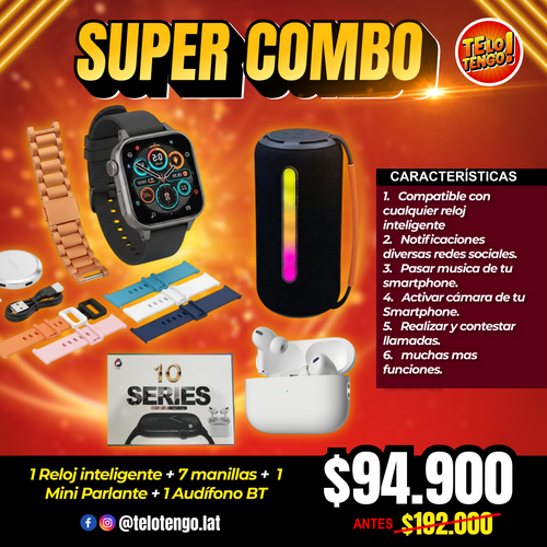 Mega Combo 4x1 (Reloj Inteligente + 7 Manillas para reloj + Audifonos Inalambricos + Parlante de mano)